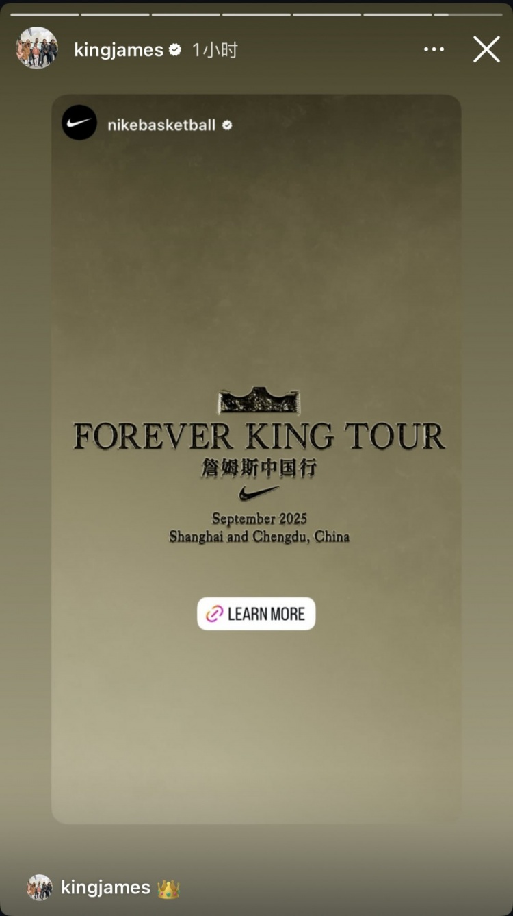 他转发了耐克篮球官方账号宣布其2025年中国行的消息,并配上了👑表情符号以示回应。