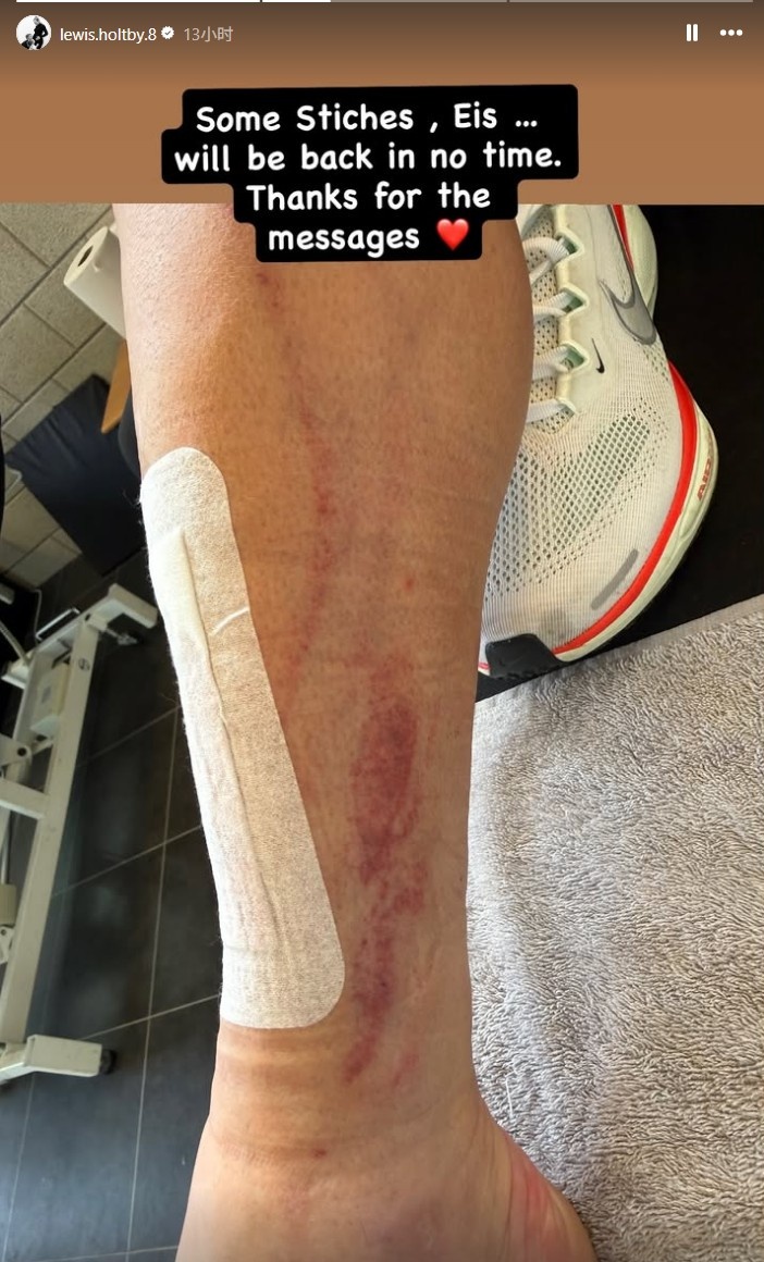 比赛结束数小时后,霍尔特比在Instagram上发声,发布了一张他饱受摧残的胫骨照片。伤口上贴着一条长长的胶布,旁边还能看到其他多处擦伤。他在照片旁写道:“缝了几针,上点冰敷。我很快就会回来,谢谢你们的留言。”