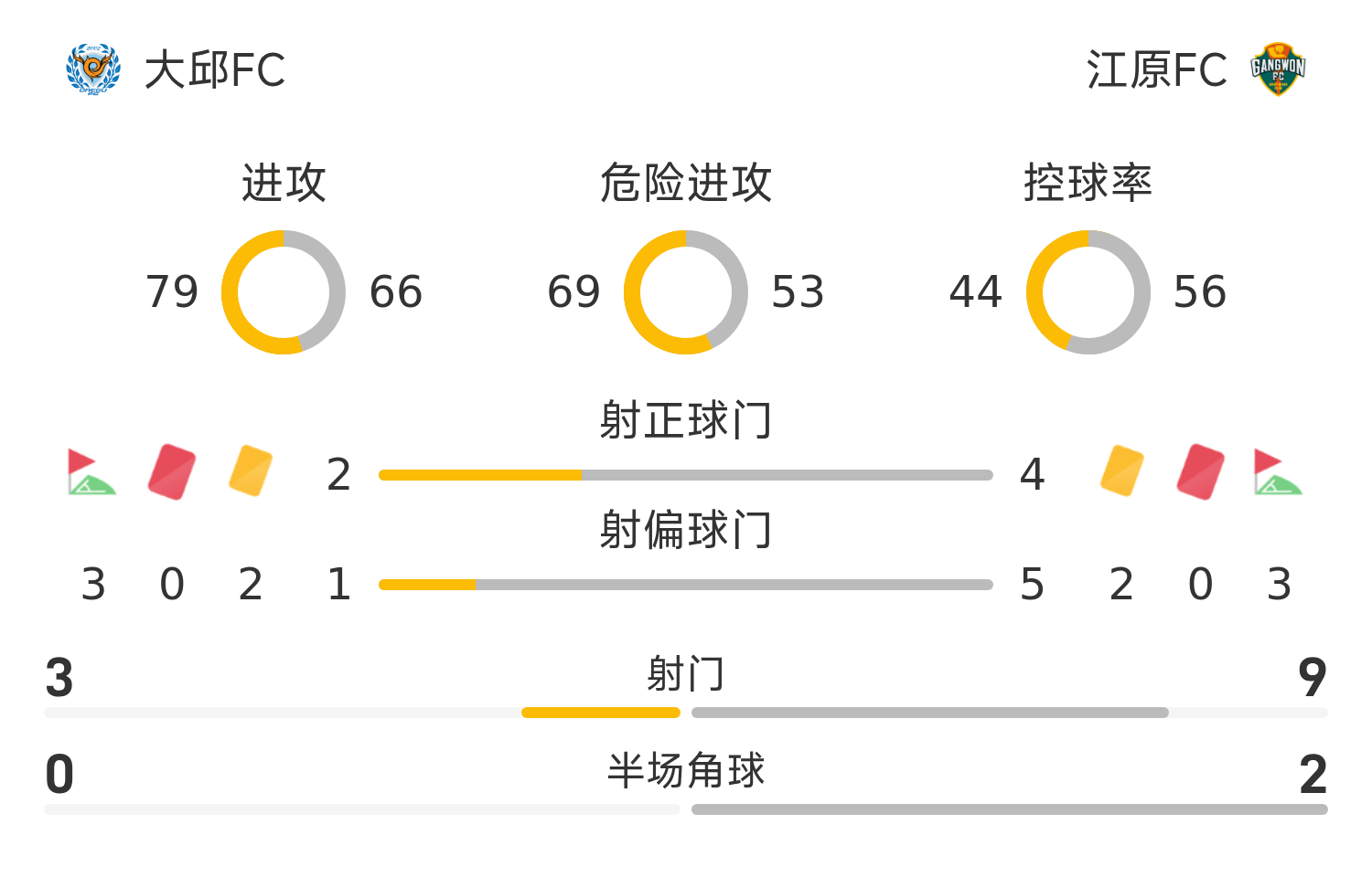 此后双方再无建树,半场战罢,江原FC暂时1-0领先大邱FC。